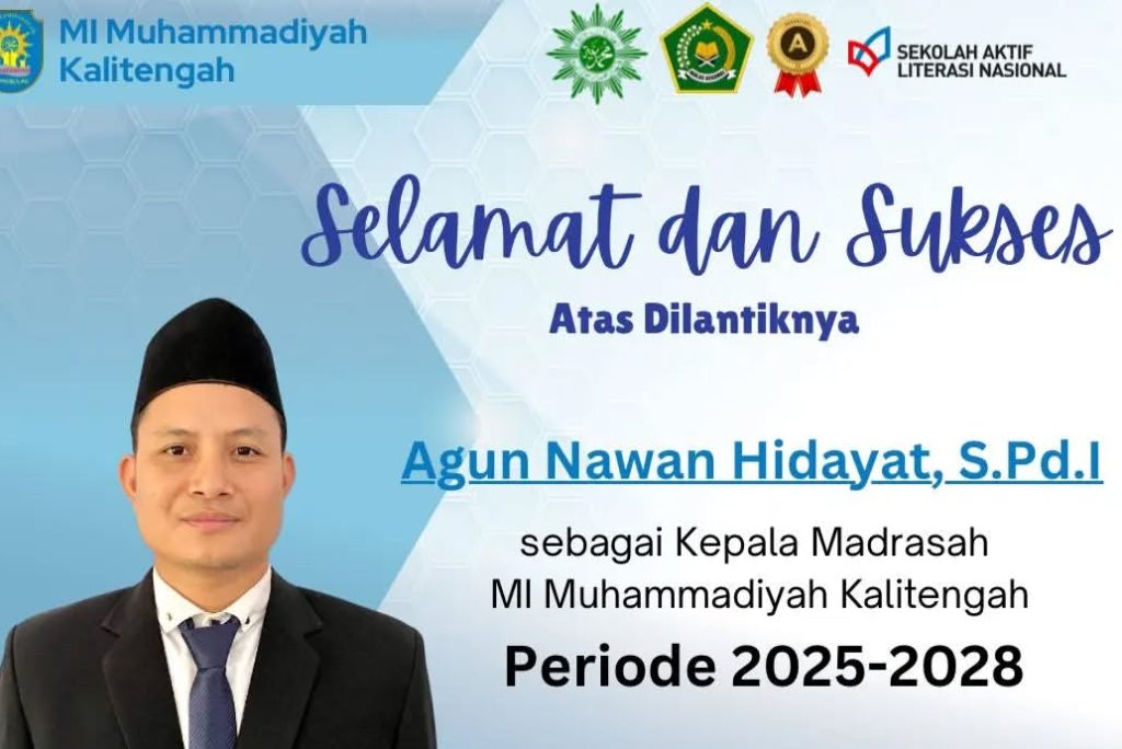 MI Muhammadiyah Kalitengah resmi melantik Agun Nawan Hidayat, S.Pd.I sebagai Kepala Madrasah untuk periode 2025-2028. Pelantikan ini merupakan bagian dari upaya peningkatan mutu pendidikan di lingkungan madrasah yang berlandaskan nilai-nilai Islam dan Muhammadiyah. Sebagai kepala madrasah, Agun Nawan Hidayat memiliki peran strategis dalam menentukan arah kebijakan pendidikan, membangun lingkungan belajar yang kondusif, serta meningkatkan kualitas tenaga pendidik dan peserta didik.